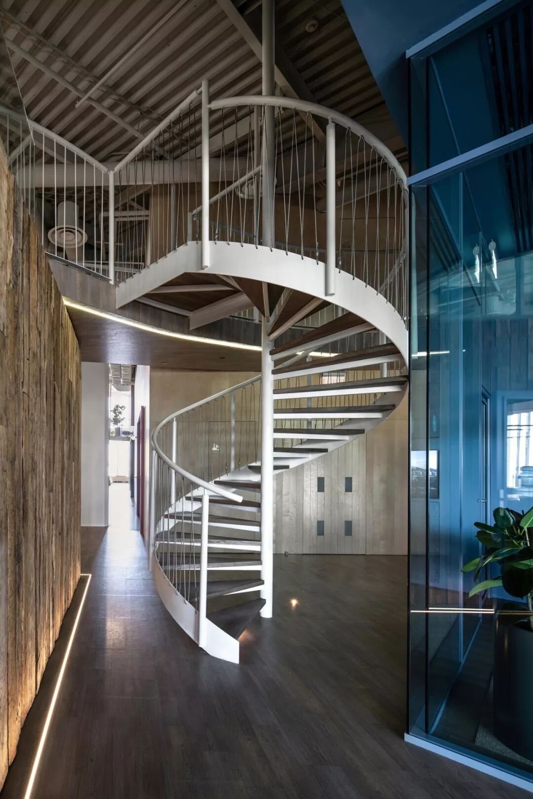在这整个空间中,有一个最关键的元素——那就是这个桥梁。它以柔和的曲线环绕着办公室,将办公室的各个功能区域相互连接。