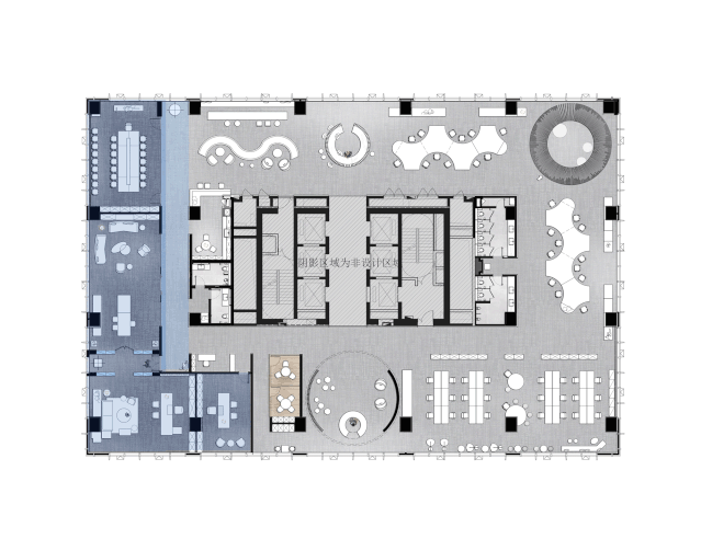 服务点位的设置主要以休闲洽谈和智能办公为主,因为这个空间也有着样板间的属性。在这个位置上,设计师也考虑到参观客户在体验到整个办公系统的同时,也可以在服务点位进行商务洽谈的功能。既是办公场域也是销售服务的空间。