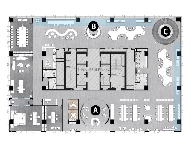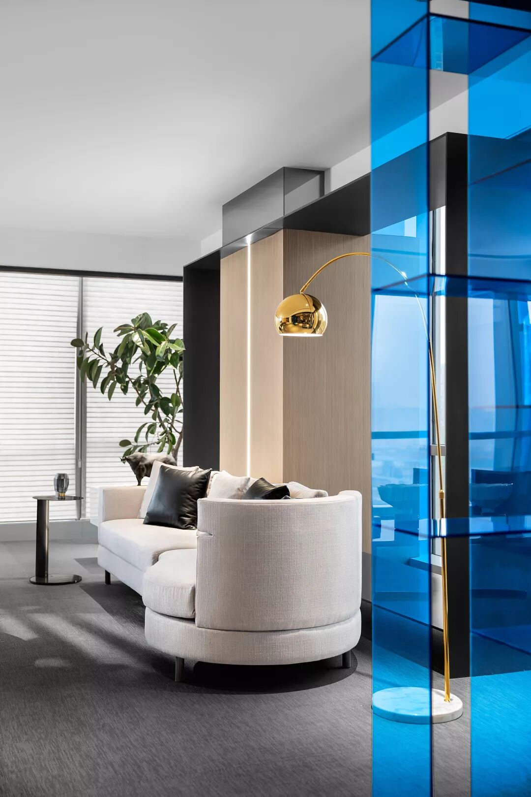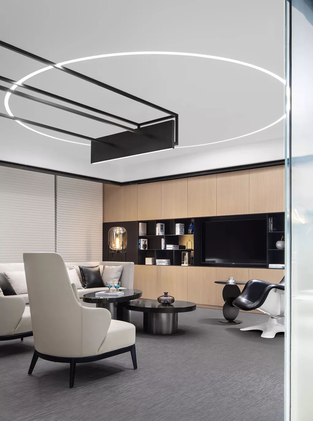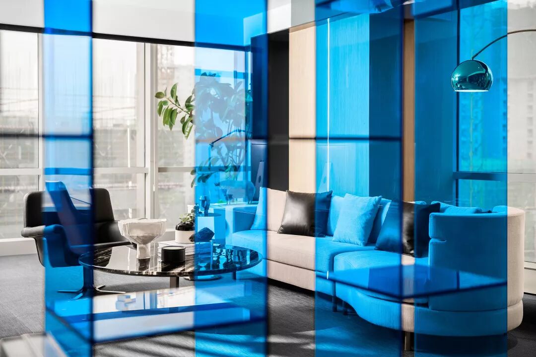 总裁接待区采用了半通透的设置,满足私密性的状态下,给到内部最好的采光度。