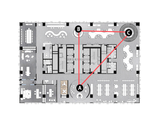 空间的新生,不仅仅有视觉的更新,功能聚合如同空间呼吸被更新迭代。半围合的休闲区也是为此诞生,作为关联点位参与办公空间动态体验的一个重要节点区域。