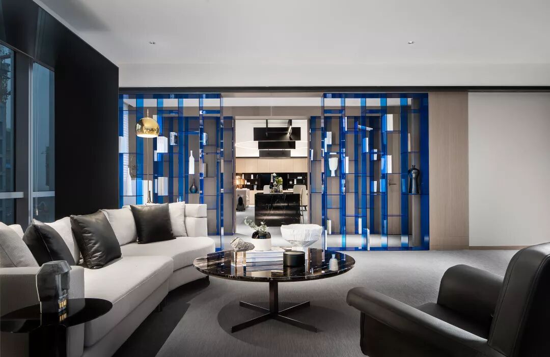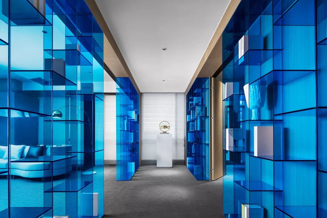 几何框架式的柜体设计放置在最合适的地方,蓝色亚克力的材质定制,让宝蓝色在整个黑白灰相间的空间里更加个性化的表现。