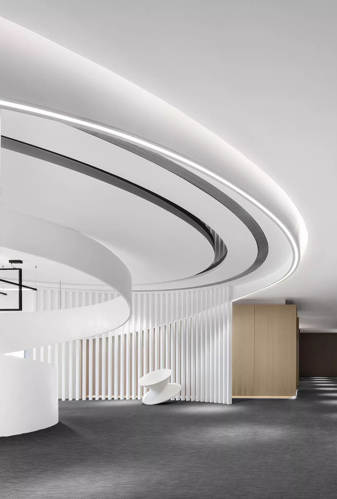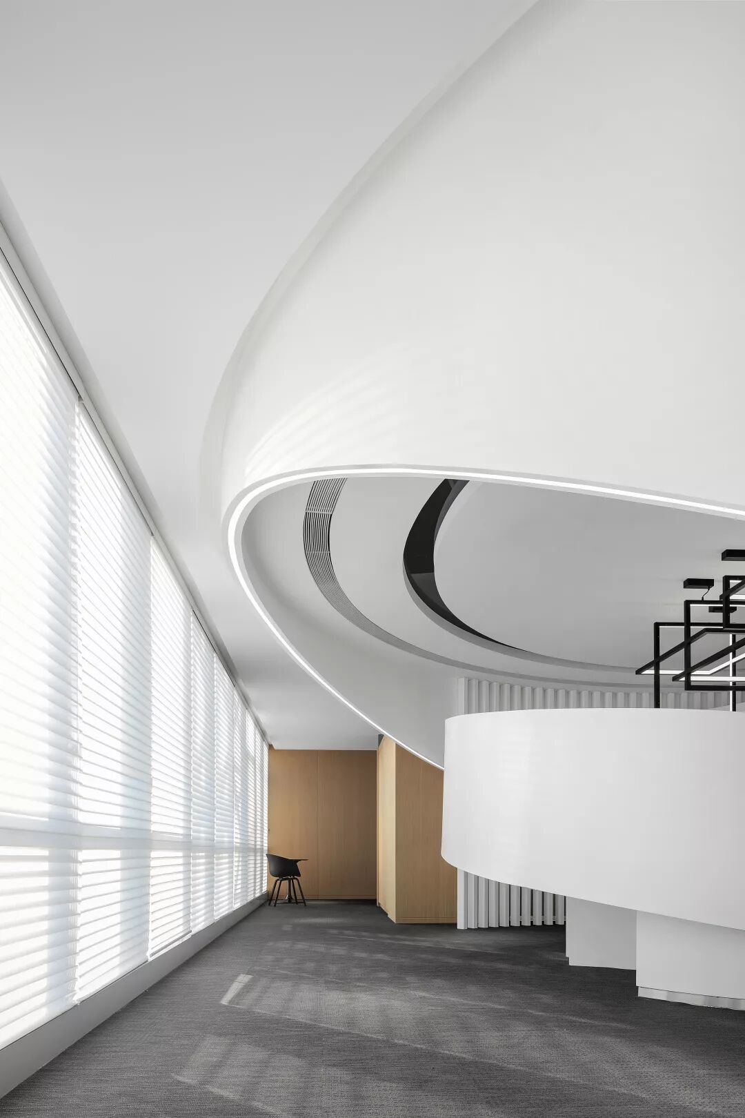 在前台接待区域设置了半围合的曲线造型组合,也是作为进入空间中第一印象的存在。实体均采用浅色涂料,在带来温和基调的同时创造出一个有机的‘身体’,使前台接待区域以一种较为现代且充满建筑体量的形式自然出现。