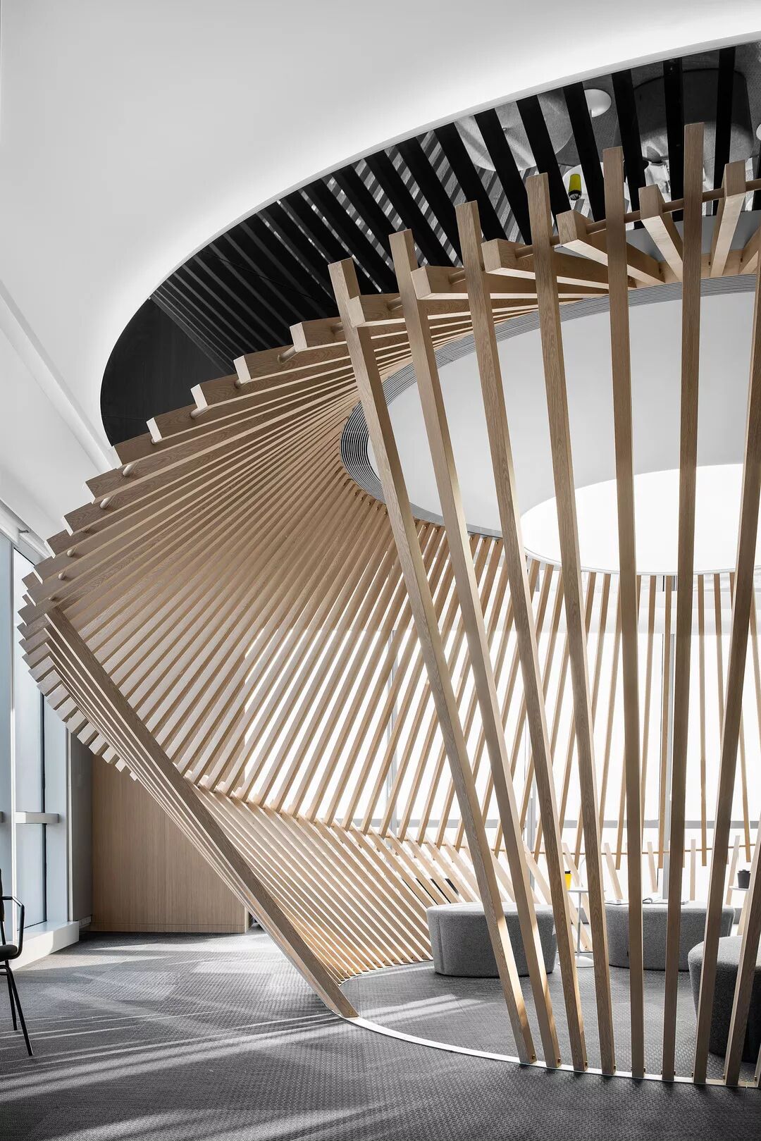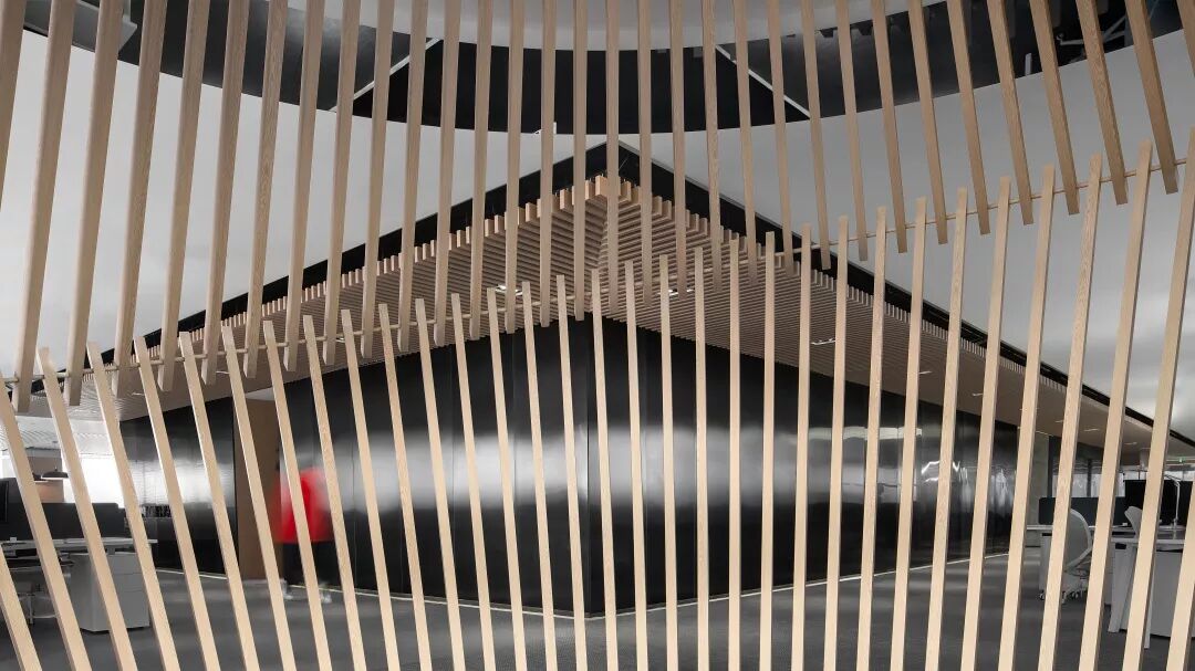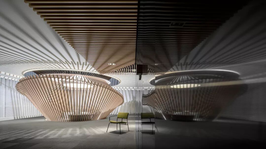 木作的旋转起伏,仿佛是一个办公机器的核心齿轮,利用创新的工作环境给客户和员工提供双向的环境服务,通俗而言,无论是员工,还是客户,都可以在这个空间环境里,小憩一刻或集中的消化掉小组任务。