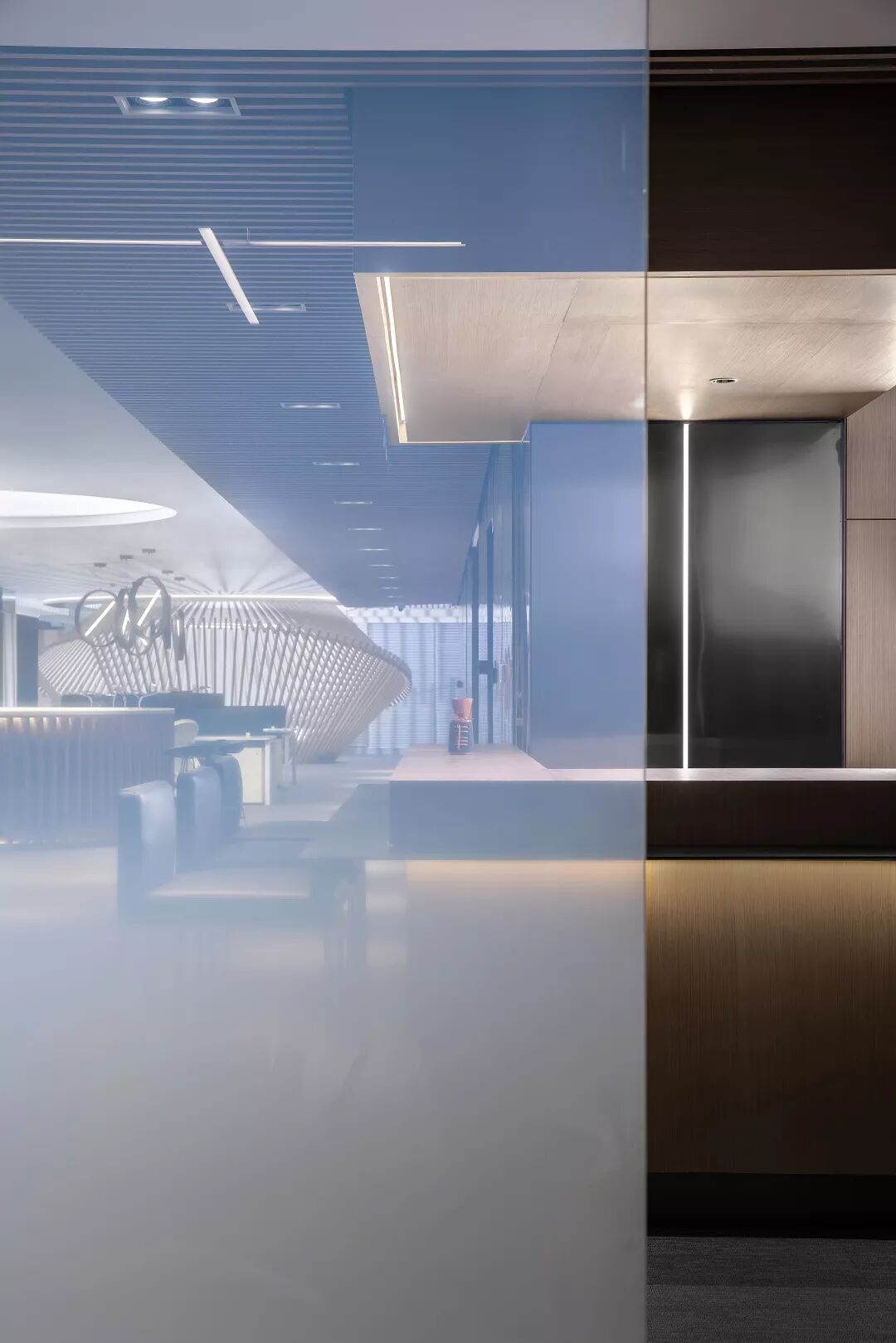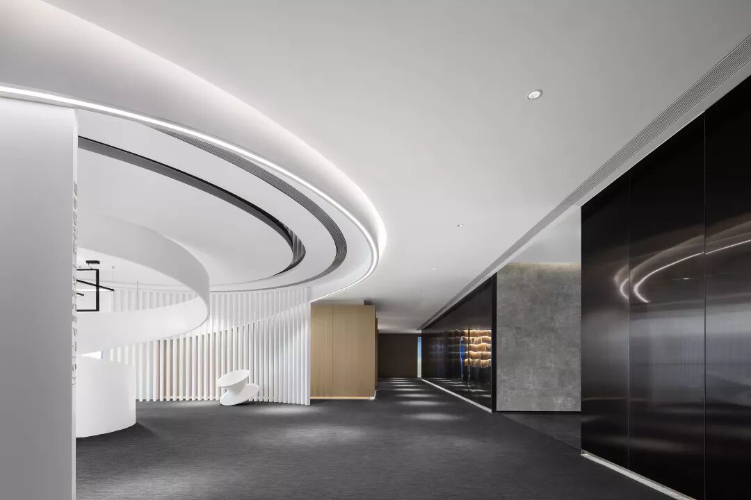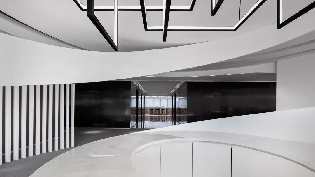 这个点位我们故意去掉了传统的“前厅”死板的设计,鼓励到来的每位客人可以直接跟随视觉进入接待区域,曲面或连续,或交叠,或独立地存在接待区域中,使人漫步其中感受到一种柔和舒适的包围感。