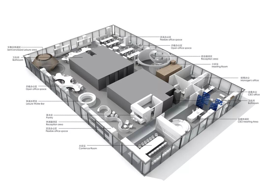 并在室内空间两侧形成体量并得以延续,这里可以完成对自由办公的需求。