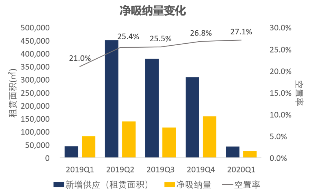 疫情影响下,各种负面信息及不确定性一定程度打击了企业的信心,部分企业推迟或取消原定的新设立或搬迁计划;同时,不明朗的疫情情况和波动的经济市场进一步挤压部分企业的生存空间,第一季度退租案例明显增多,空置率进一步上升。多方面因素导致第一季度净吸纳量大跌:环比下跌83.6%,较去年同期下降68.6%。