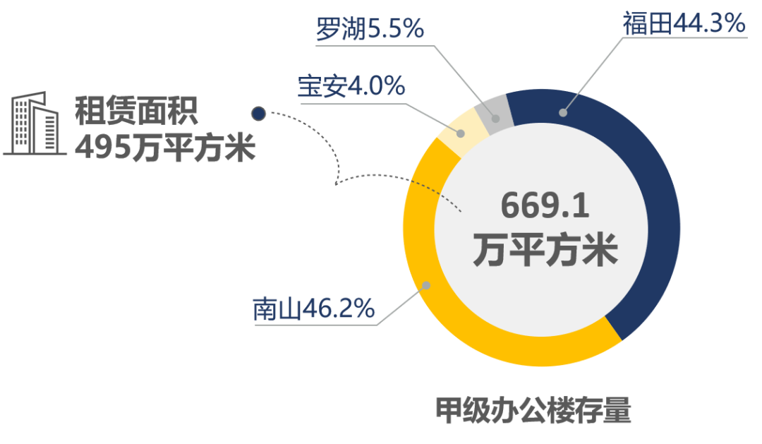 2020年第一季度甲级办公楼宇存量达到669.1万平方米。本季度新增一个甲级物业入市租赁,位于科技园片区,全市租赁面积增至495万平方米,其中南山区和福田区存量占比超过90%。