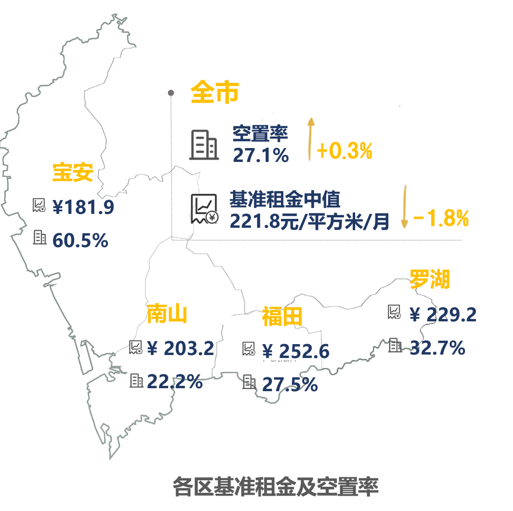 需求端受到了疫情的冲击,市场普遍下调了对市场的预期,全市租金持续小幅下跌,租金环比下降1.8%。各区租金均有不同程度的下跌,其中福田中心区租金跌幅最大,为4.6%。而整体空置率环比上升0.3个百分点。