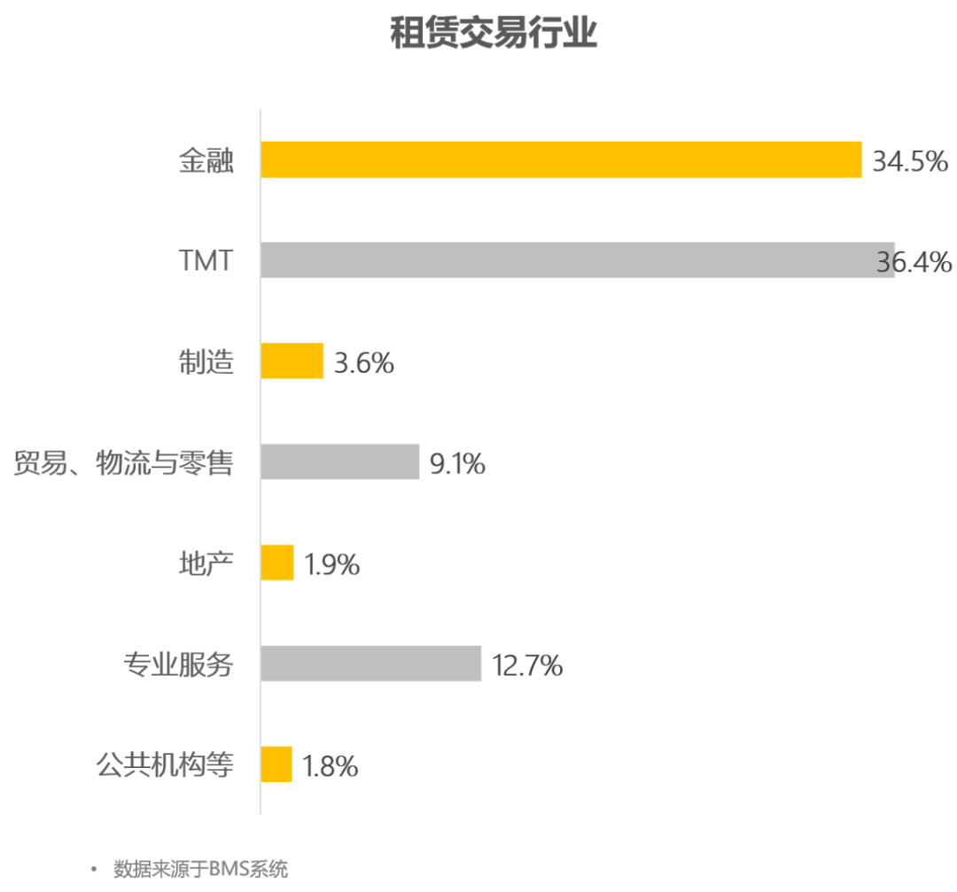 金融和信息技术仍然是在交易市场上最活跃的两大行业,疫情加速了企业的在线化转型和扩张,信息技术行业的交易量占比较上一季度有较大幅度的上升;房地产行业及公共事务的租赁交易量环比呈下降态势。疫情爆发和停工对房地产行业的现金流和融资能力施加了额外的压力,租赁相关事宜受较大限制;在疫情的影响下,外国的公共事务机构将推迟或暂时取消在深圳设立办事处。