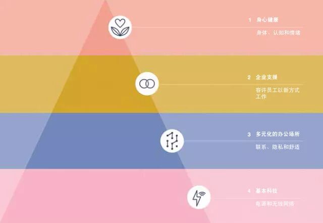 正如人类有基本生存需求(食物、水和居所等),员工在办公场所也有不同维度、层级的需求。企业除了必须在办公室为员工提供基础科技设施之外,还需要提供更多不同类型的空间,让员工可以自由选择喜欢的工作地点和方式。通过办公需求的优化升级,企业在提升员工工作表现及敬业度的同时,也改善了他们的身心健康。