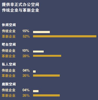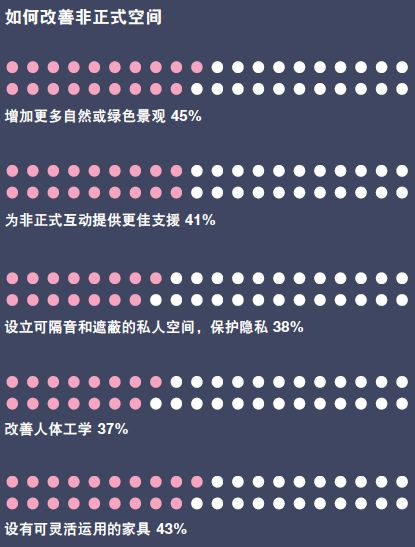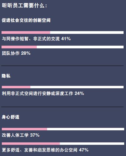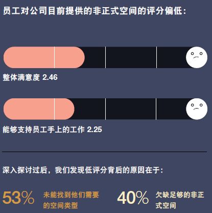 该调查显示出员工对于创新空间、隐私、身心舒适三方面的需求。其中,员工对于公司目前提供的非正式空间的评分偏低:40%的受访者认为企业欠缺足够的非正式空间,而53%的受访者未能在企业中找到他们真正需要的空间类型。