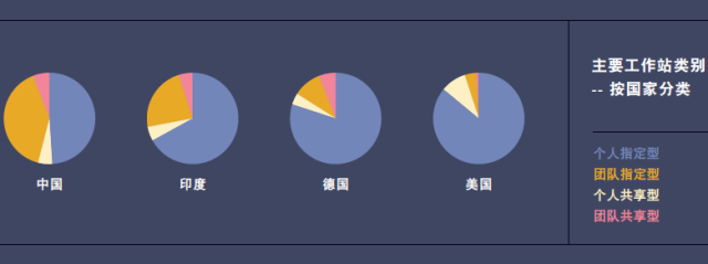 文化转变:从主要工作站的类别来看,中国与印度相较美国和德国的企业来说,个人指定型工作站的比率较低,而团队指定型和团队共享型工作站的比例则较高。可见在中国和印度,员工花在自己工作站上的时间更少。这正可以看出,我们的企业正在积极推进移动办公和团队协作。