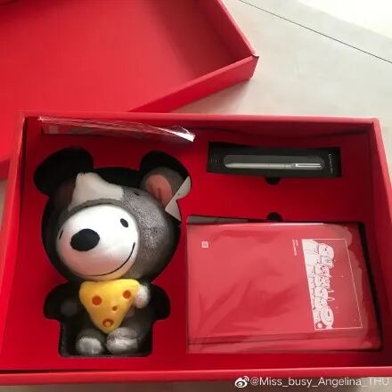 京东的定制入职礼盒用的logo主题红色,内含一支钢笔、印有京东动物家族的笔记本、和一只穿着老鼠套装的京东狗玩偶。