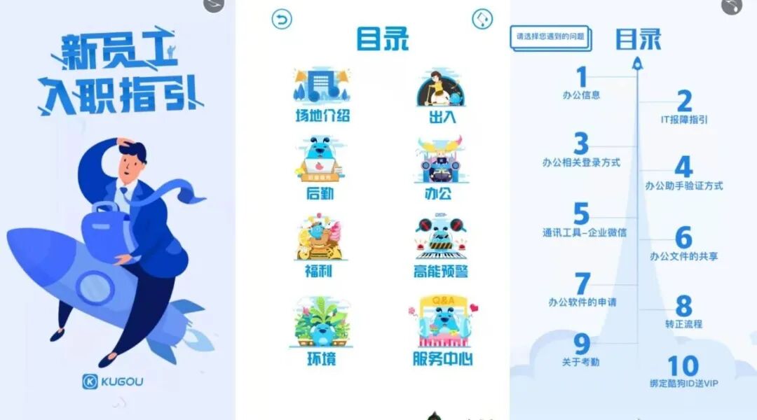 在酷狗的入职指南上,新员工根据自己的身份,通过指定二维码填写入职资料,节省了新员工到处跑流程的时间及人工成本。