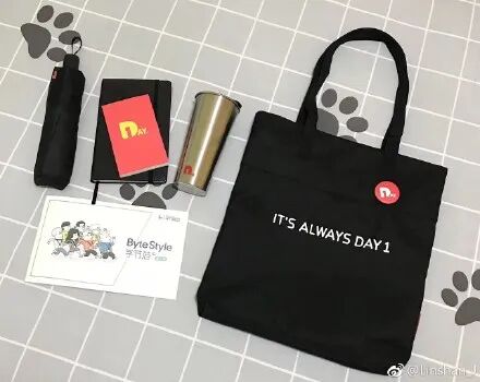 字节跳动的入职礼中,有雨伞、笔记本、水杯、贺卡,和一个帆布包。上面印着「IT'S ALWAYS DAY 1」,既包含了企业的温暖关怀,又有对新员工的无限期许。