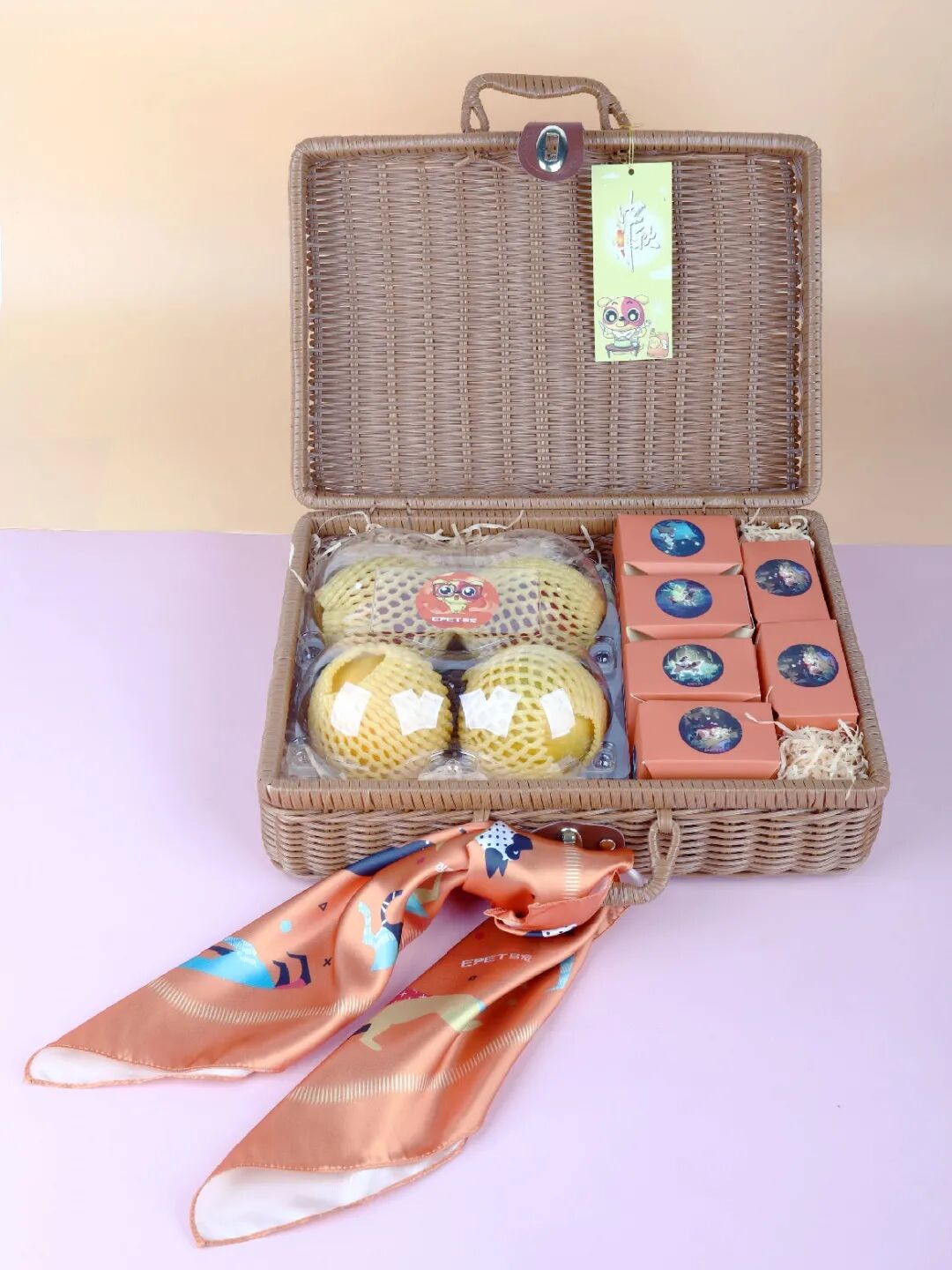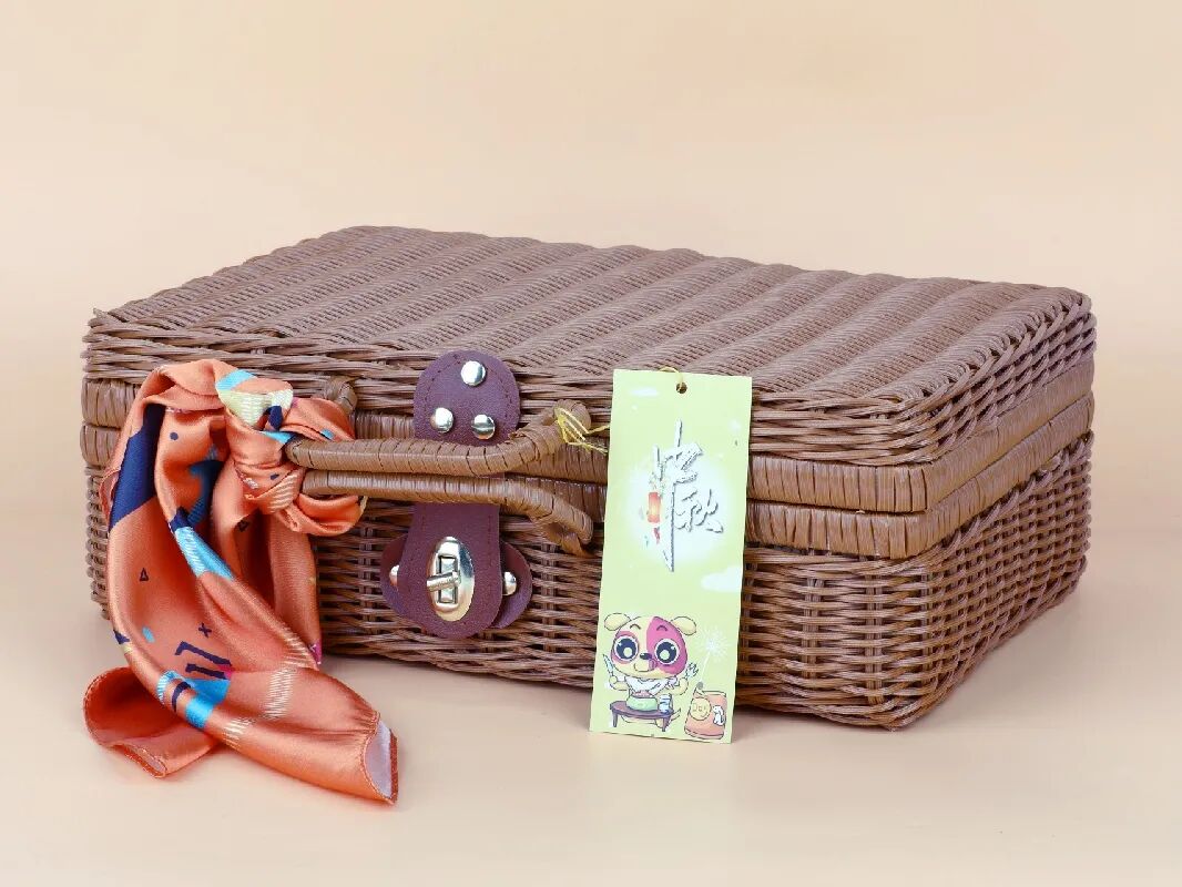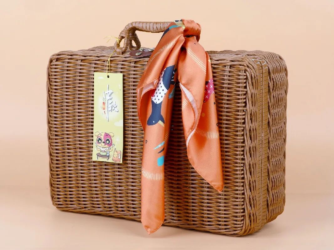 中秋礼盒以编织手提箱为主,系上方巾