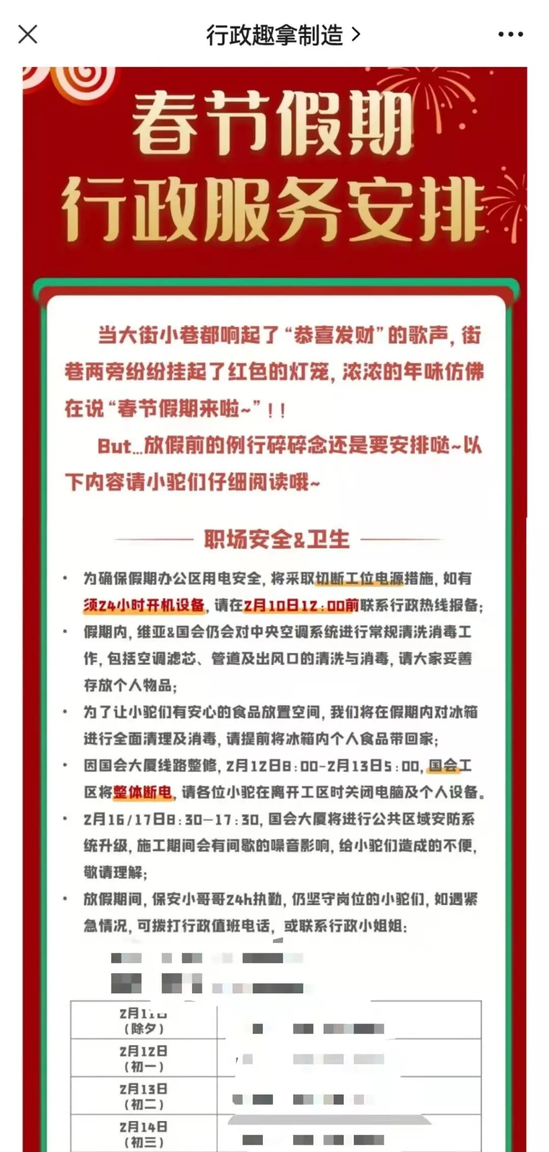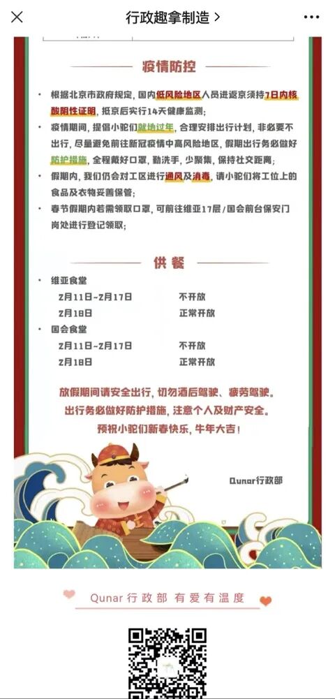 ·21年春节去哪儿网发布的「春节假期行政服务安排」非常的全面,以职场安全&卫生、疫情防控、供餐三个方面来提醒大家~