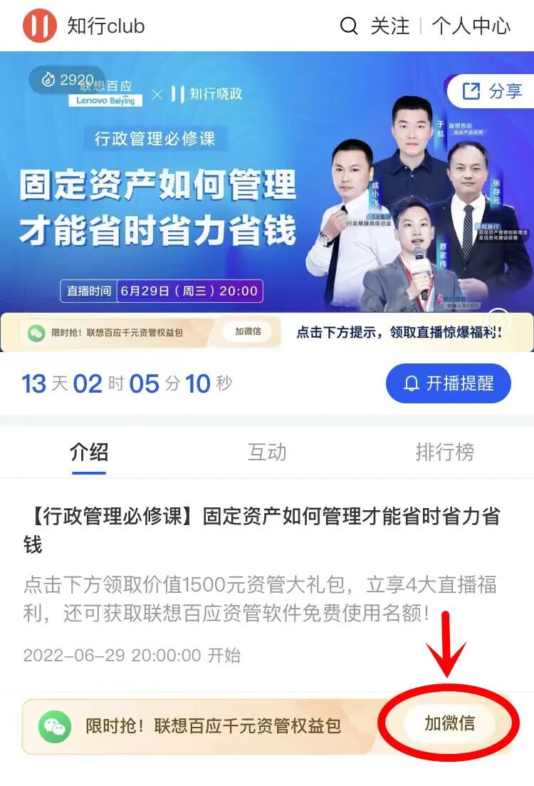 进入直播页面点击“加微信”,扫码进入小程序,即可领取联想百应价值1500元资管大礼包: