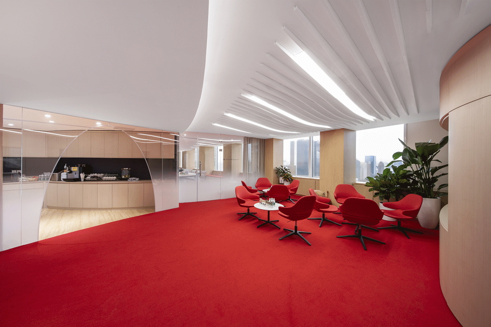 而单从布置上来看,门厅其实只有前台和会客桌椅,正因为有了大面积红色的加入,整个空间的更具张力,简洁的设计中透出了一股坚定的力量。