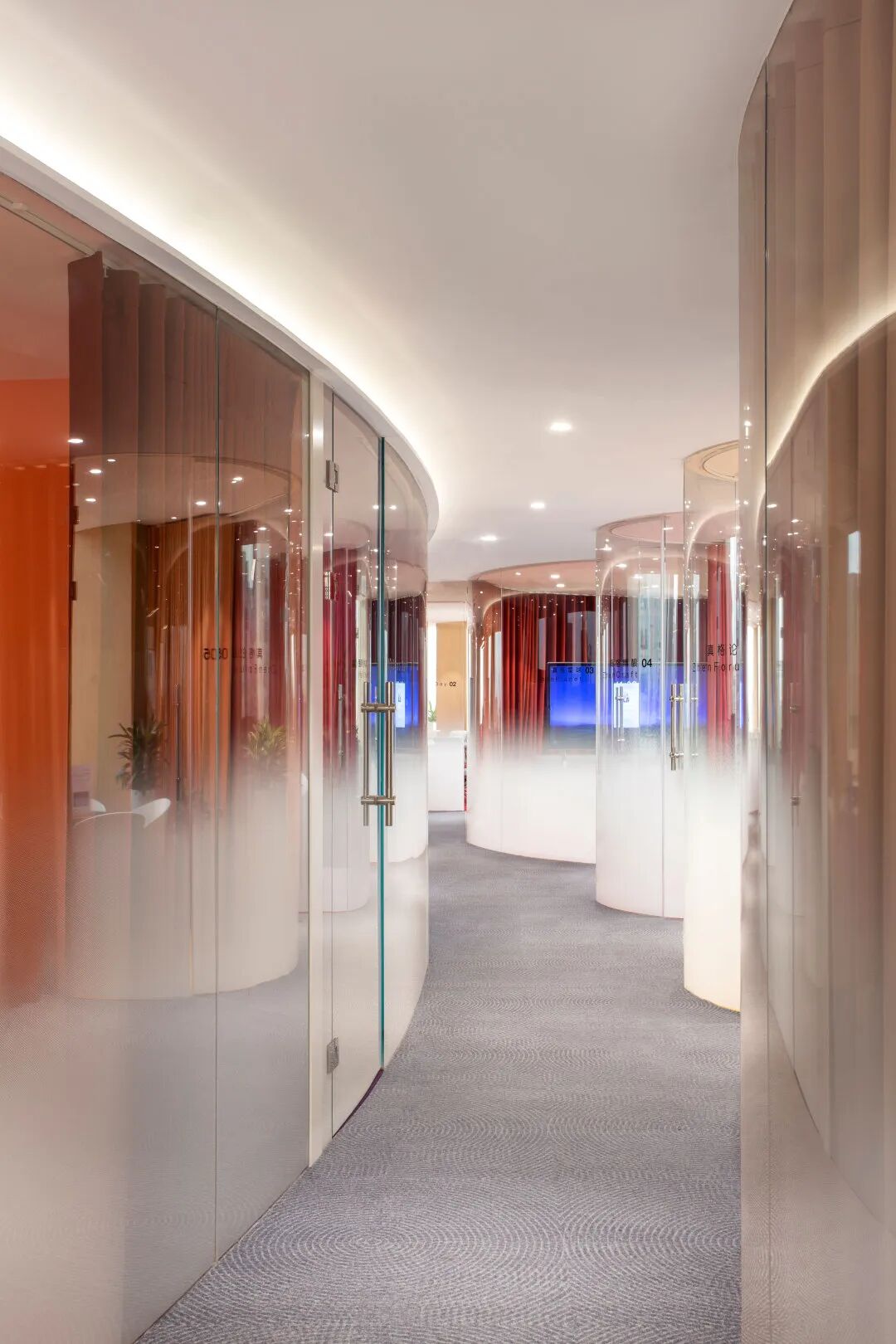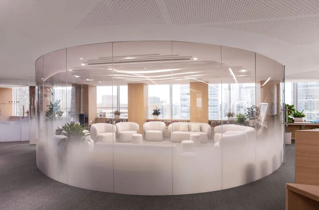 而顺着会议室区域的走廊看过去,这些凹凸错落的玻璃外墙成为了最具艺术气息的装饰。也因为这种具有包容感的造型,让员工在与会时倍感舒适和放松。