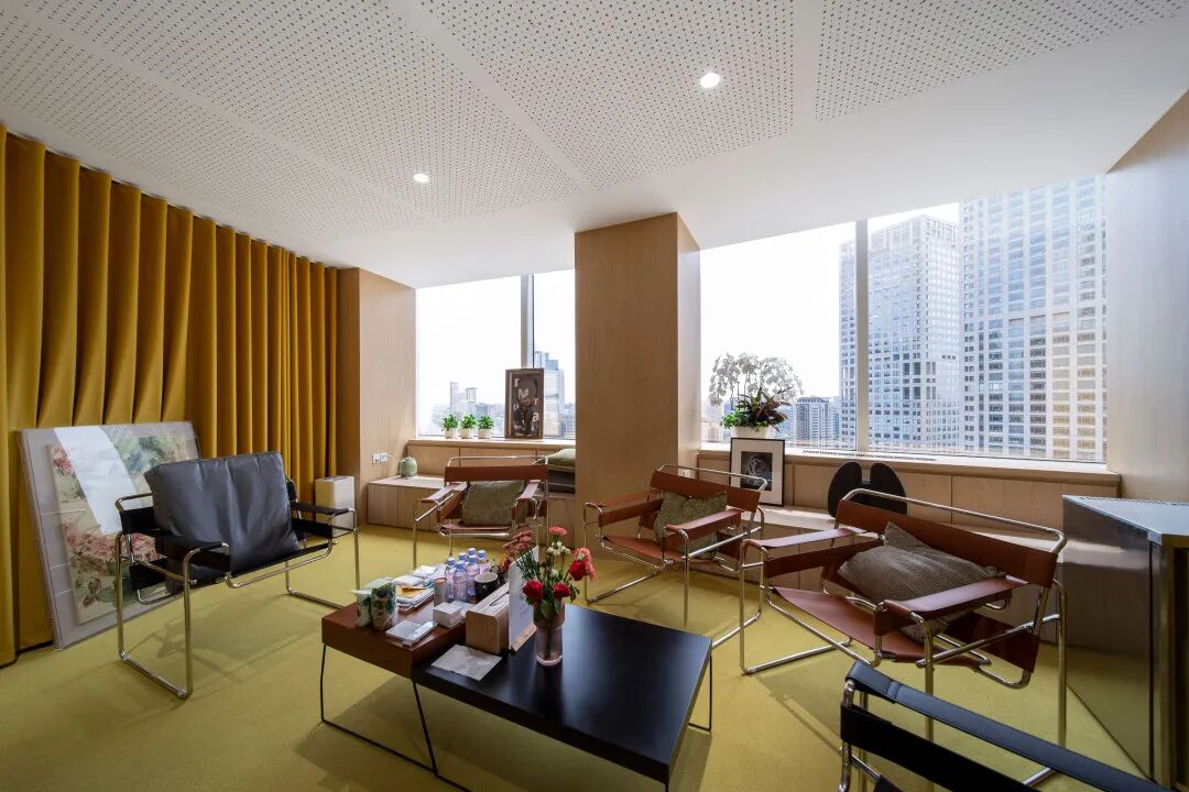 而另外一间独立办公室,则是使用了偏暖的芥黄色,造型轻巧的座椅,拉满了空间的艺术感,含蓄内敛却又充满活力。