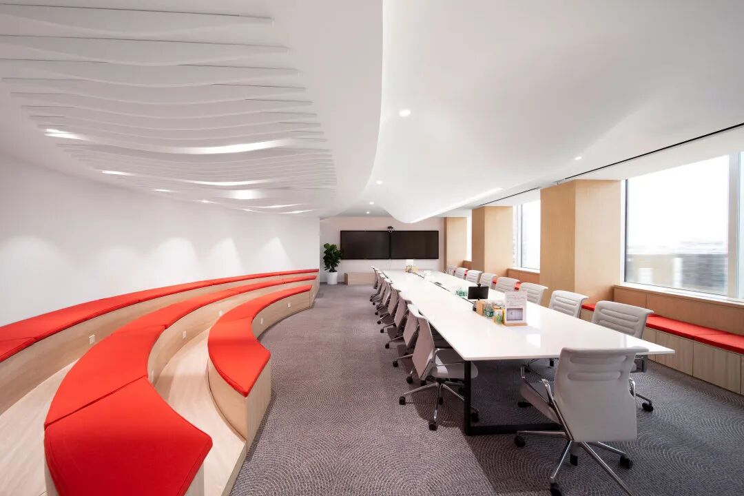 还有大会议室的环形坐席,在有限的空间内,增加了更多的座位,也与会议桌上方具有流动感的低垂状造型,形成了呼应,更像是一个灵感降落所迸发出的阵阵涟漪。