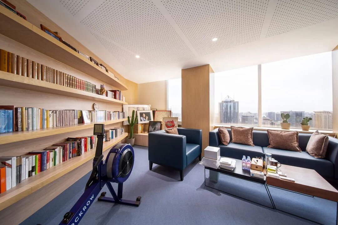 深蓝色的这间办公室则更加理性,绿植也换成了表达坚韧的仙人掌,满墙书架与运动器械一静一动的搭配,彰显出一种睿智的生命力。