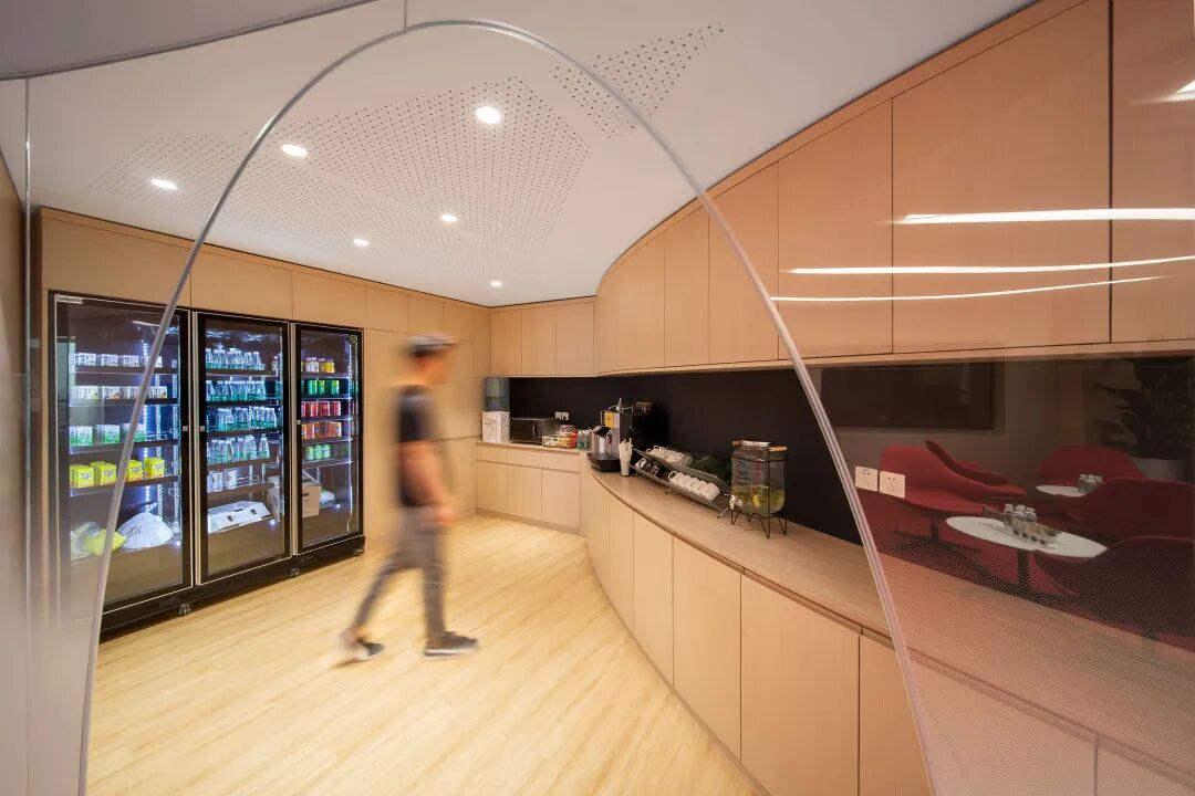 就连门厅位置的茶水间,也设置了圆拱形的开放玻璃门。不仅方便员工和访客的使用,还在保留空间完整性的同时,保持了整体风格的统一。