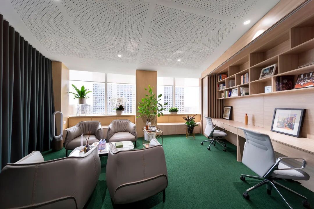 这间办公室采用了偏冷调的绿色搭配原木色,使得空间冷静沉着又不失自然舒适。