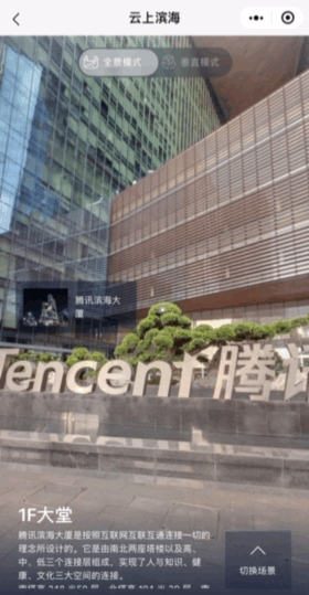 腾讯云通过VR和3D建模技术,直接把滨海大厦的公共开放区域搬上了云端,对外界开放参观。从“云上滨海”小程序进入,360度随便逛。