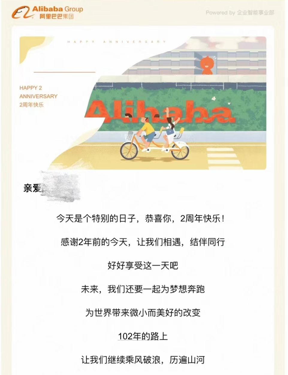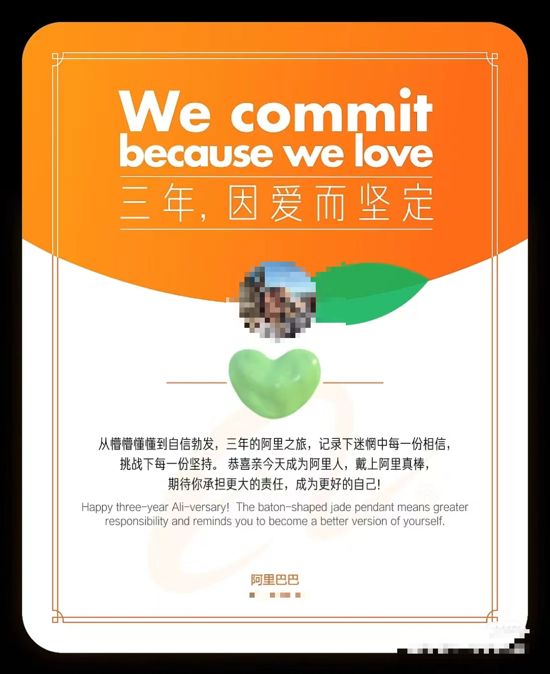 从懵懵懂懂到自信勃发,三年的阿里之旅,记录下迷惘中每一份相信,挑战下每一份坚持。恭喜亲今天成为阿里人,带上阿里真棒,期待你承担更大的责任,成为更好的自己!