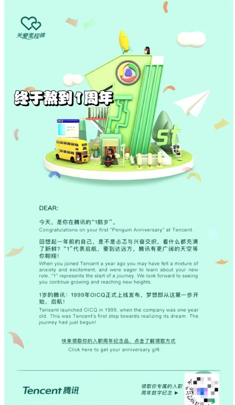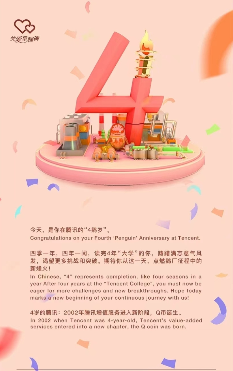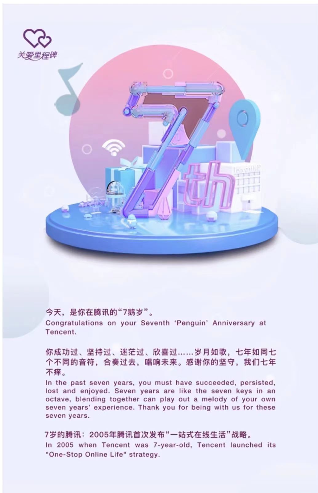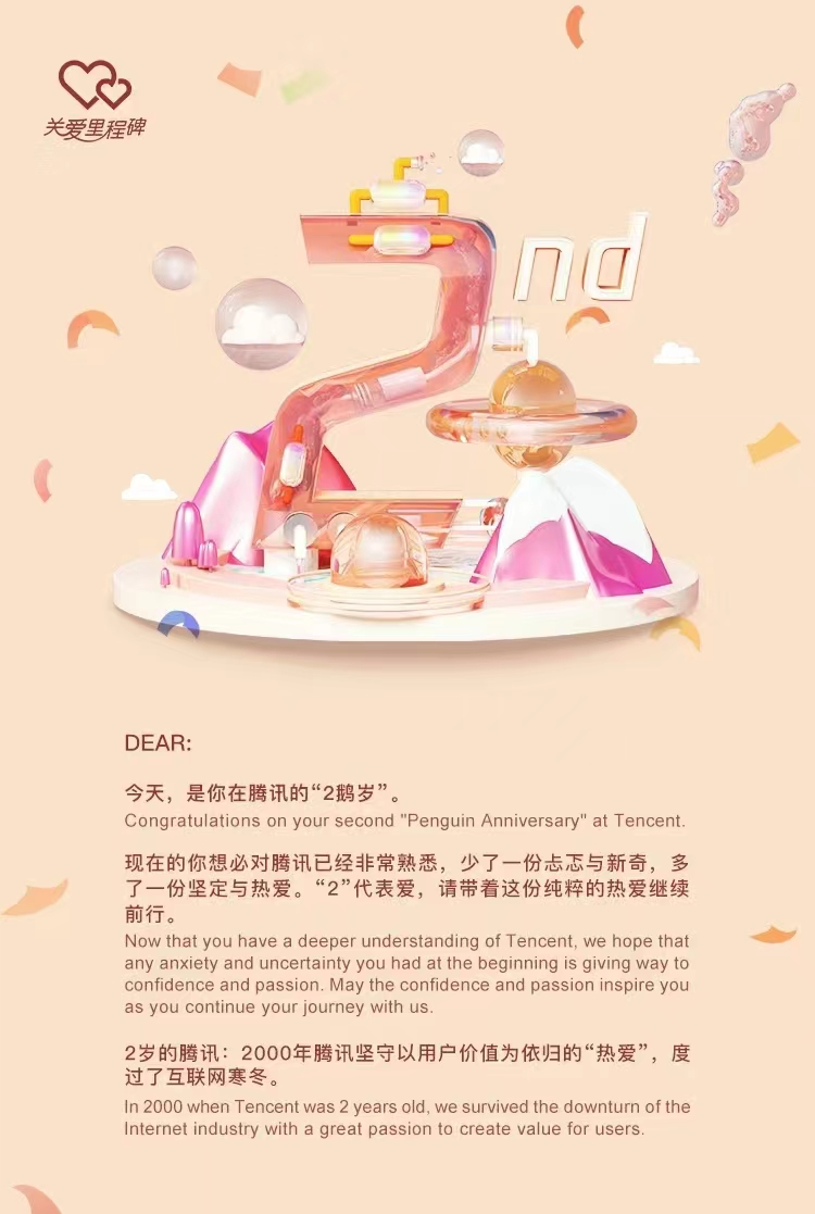 现在的你想必对腾讯已经非常熟悉,少了一份忐忑与新奇,多了一份坚定与热爱。“2”代表爱,请带着这份纯粹的热爱继续前行!
