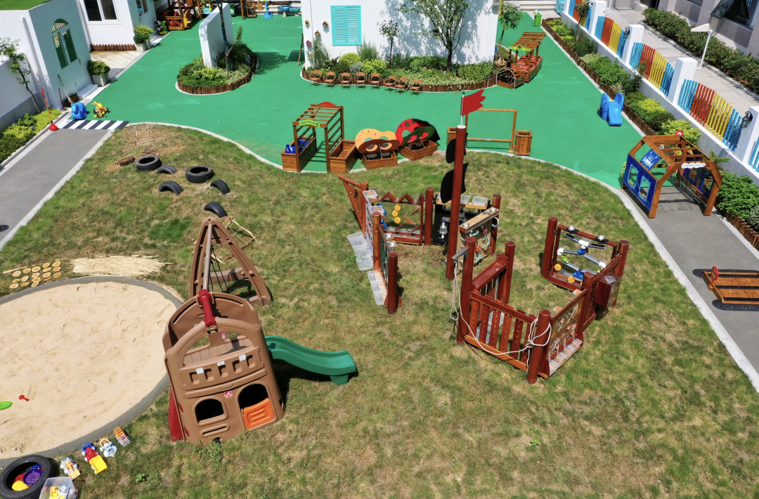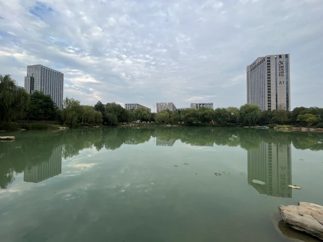 园区内部有一片户外草坪,环境开阔,还有很多游乐设施。草地尽头则是一片池塘和林荫路,湖中的鱼儿、湖畔的鸟类,形成了一个和谐的生态系统。周围有很多休憩用的座椅凉亭,方便午休的员工们过来消食散步。