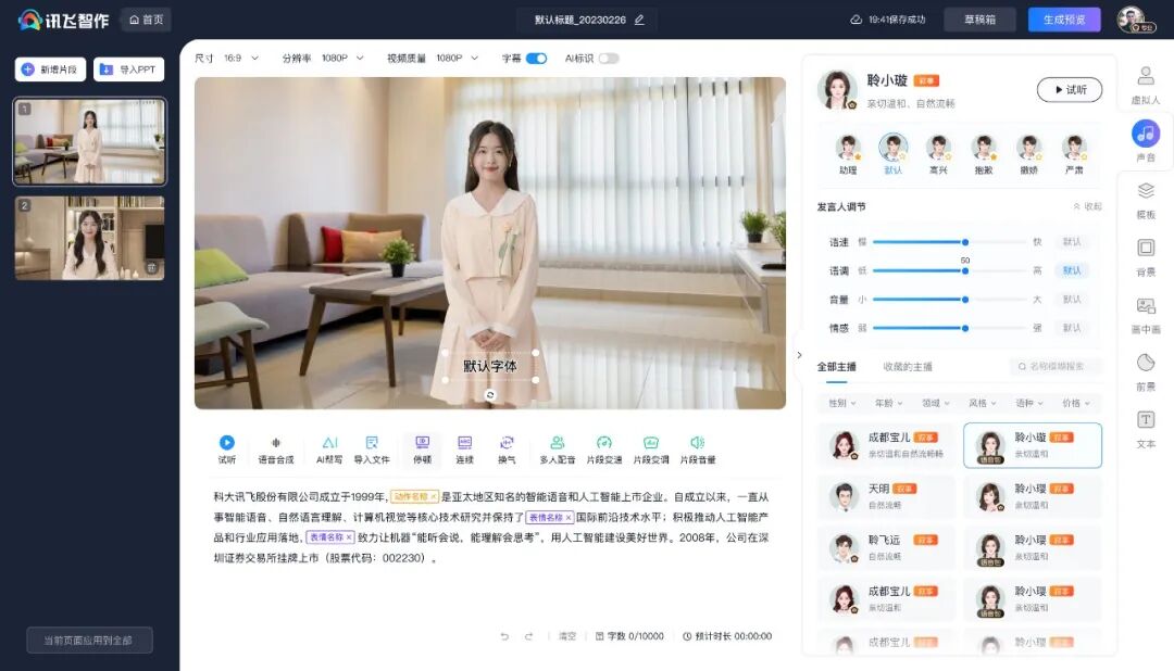 这位AI主播的形象采自一位讯飞员工,通过AI技术,她不仅可以根据要播报的文字内容自动匹配表情、口型,还可以支持英韩日德多种语言的播报。而且,虚拟主播还可以根据播报的内容切换语气。