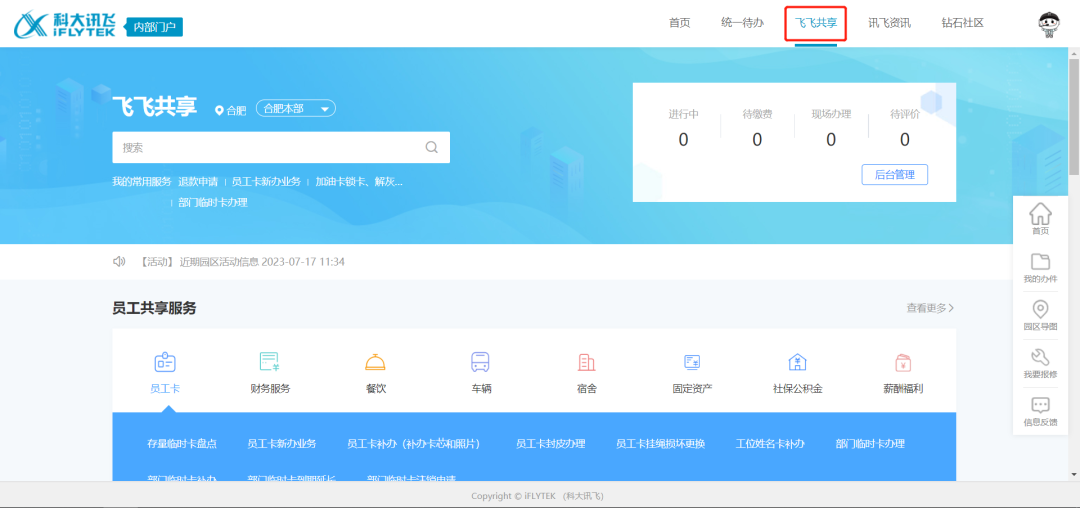 为了帮助新人快速熟悉公司,讯飞行政还在内部门户上搭建了线上的信息共享页:飞飞共享。在这里,大家可以收获2000个常见问题的回答、线上办理300个日常事项等,比如查班车、订加班餐、添加车辆入园权限、更改考勤班次……