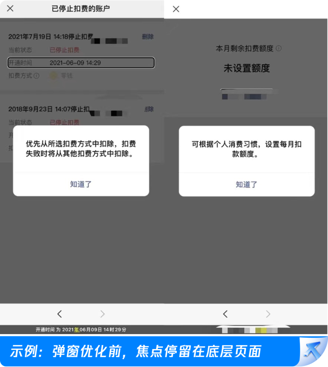 比如设置扣费方式时,部分手机读屏的焦点还会停留在底层页面,就无法读取到弹窗内容,视障朋友们就容易错过付款或重要提示。
