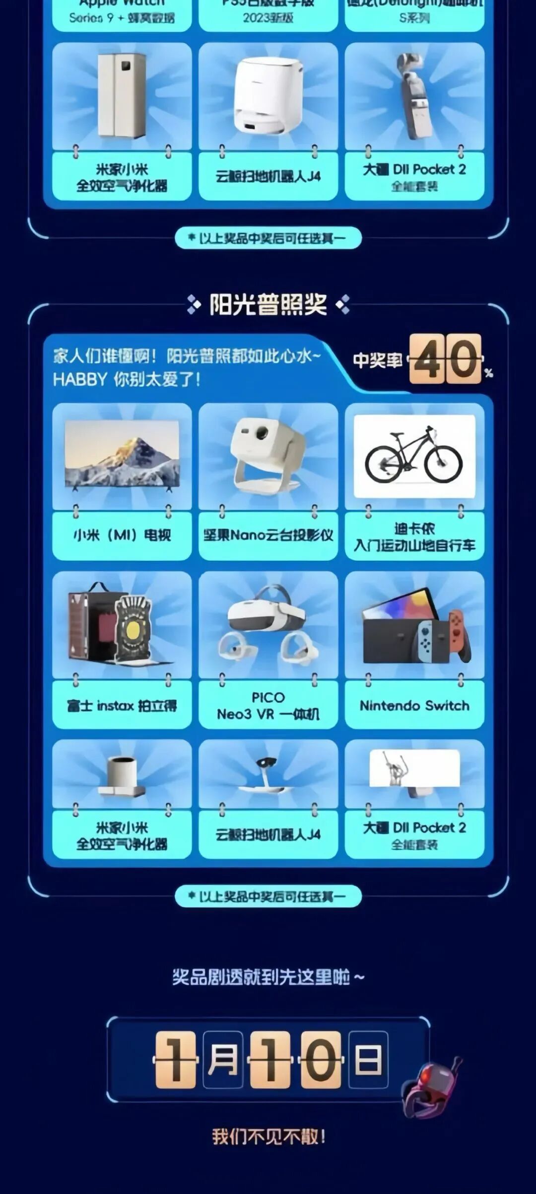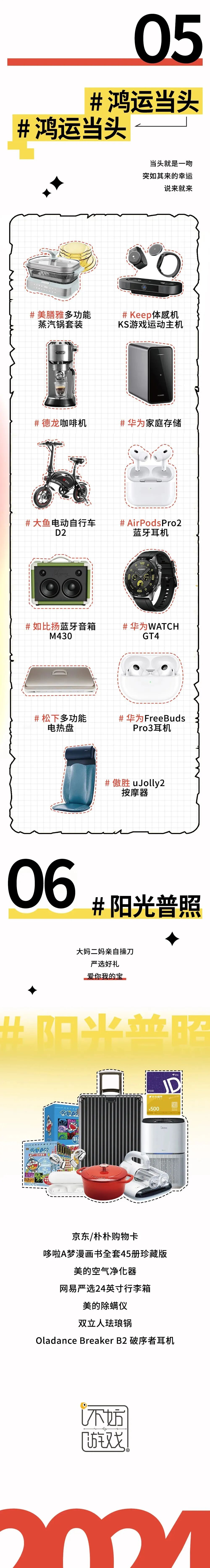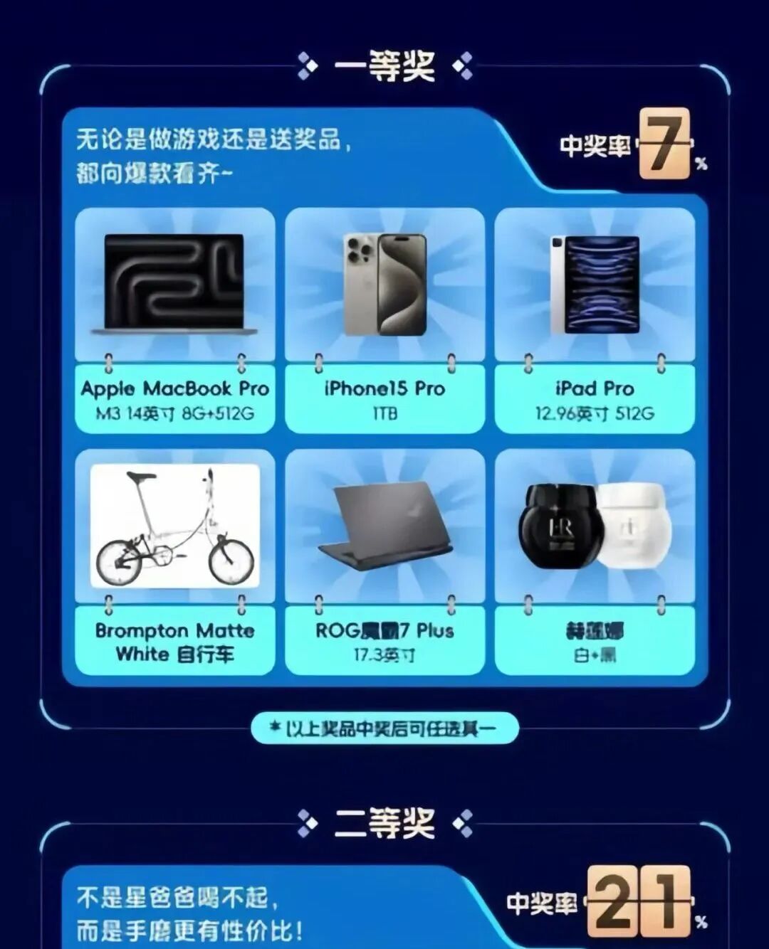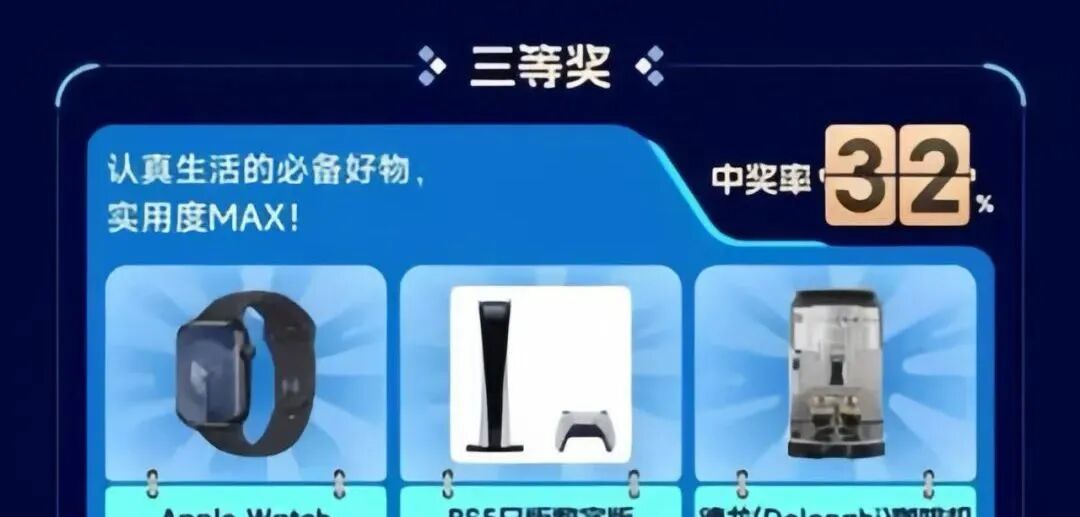 除此之外,一二三等奖以及阳光普照奖都采用了多选一的模式,均以电子产品为主,穿插了一些小家电、化妆品、自行车等。