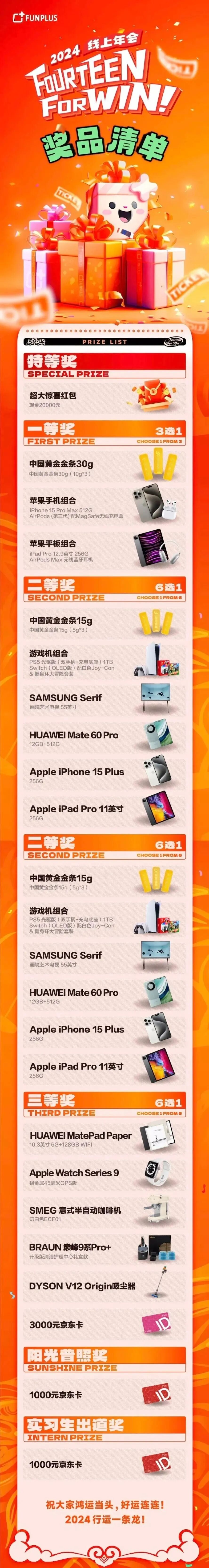FunPlus的特等奖是非常实在的2w元惊喜大红包,其余则是金条、电子产品、京东卡等,同样也为实习生准备奖项。