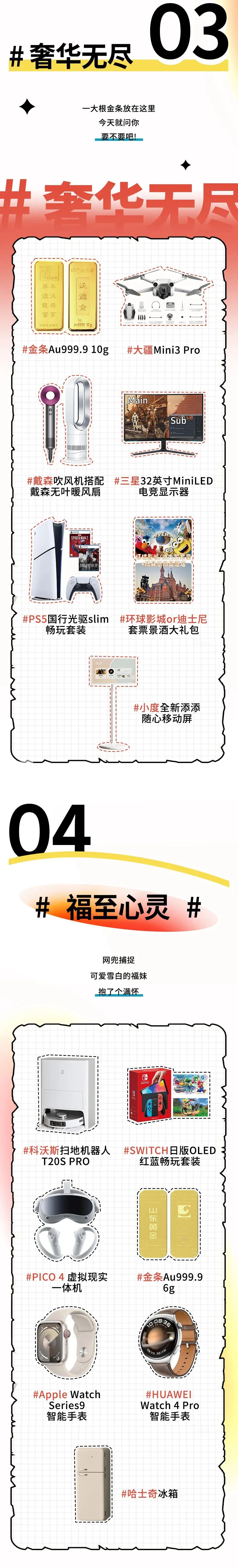 冰川网络准备的奖品类型非常丰富,特等奖有电脑、手机、金条,其余的奖项则有剃须刀、按摩器、空气炸锅、护肤品、四件套等。