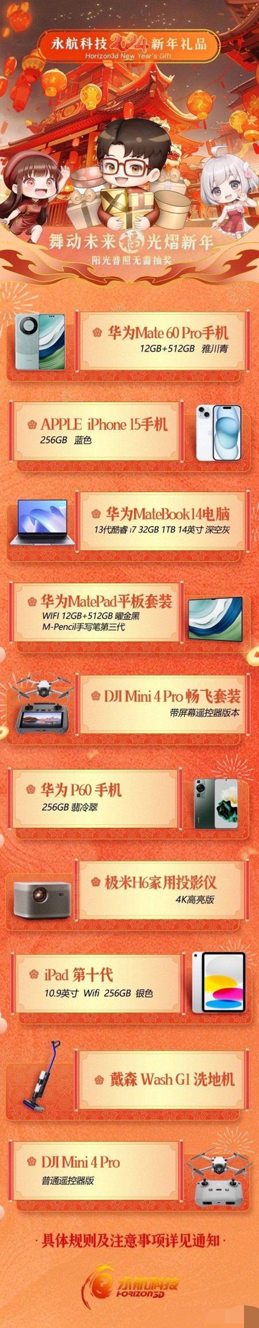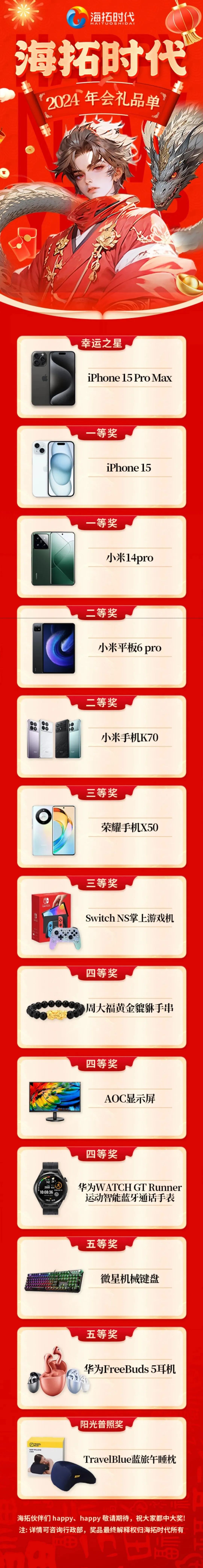 海拓时代的幸运之星奖是iPhone 15 Pro Max,其余奖品则是以手机、平板等产品为主,阳光普照奖选了较为实用的午睡枕。