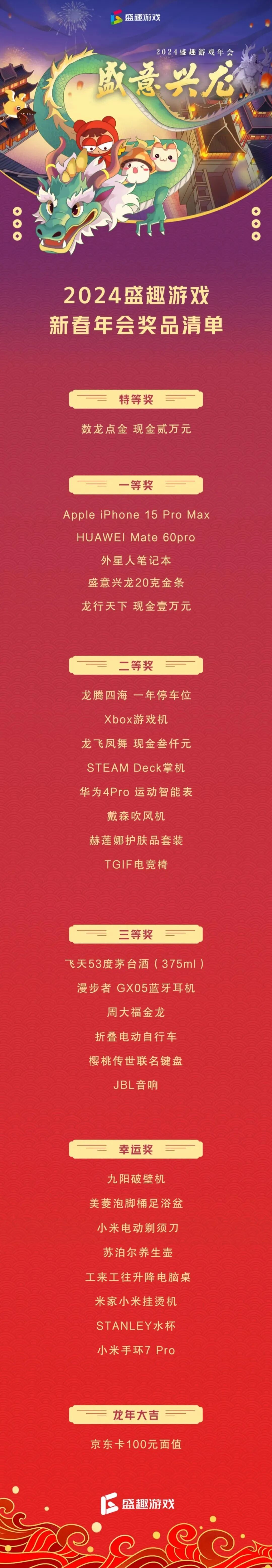 盛趣游戏与FunPlus的特等奖一样,都是2w元现金。其他奖品范围比较广,有电子产品、金条、护肤品、飞天茅台、小家电等。