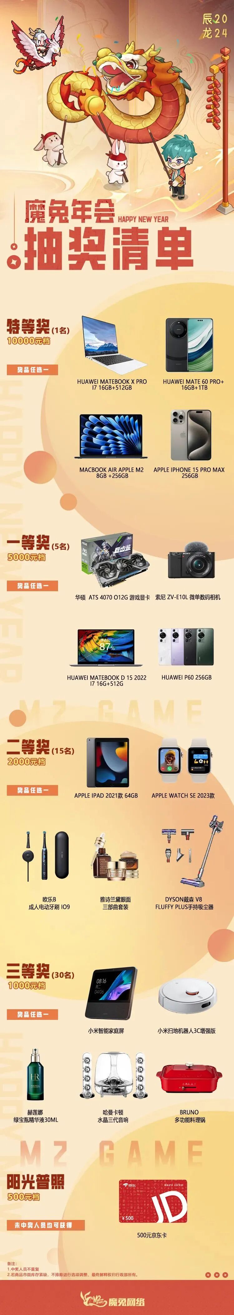 魔兔的奖品从1w元档到500元档依次递减,每当都设置了多种礼品可选,灵活度很高。