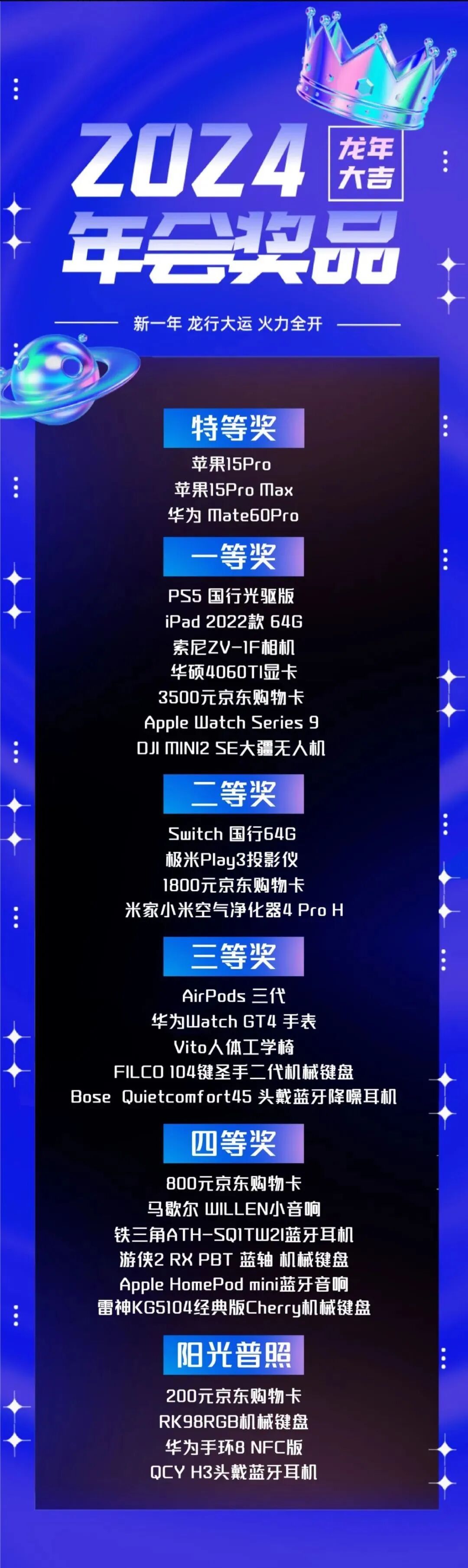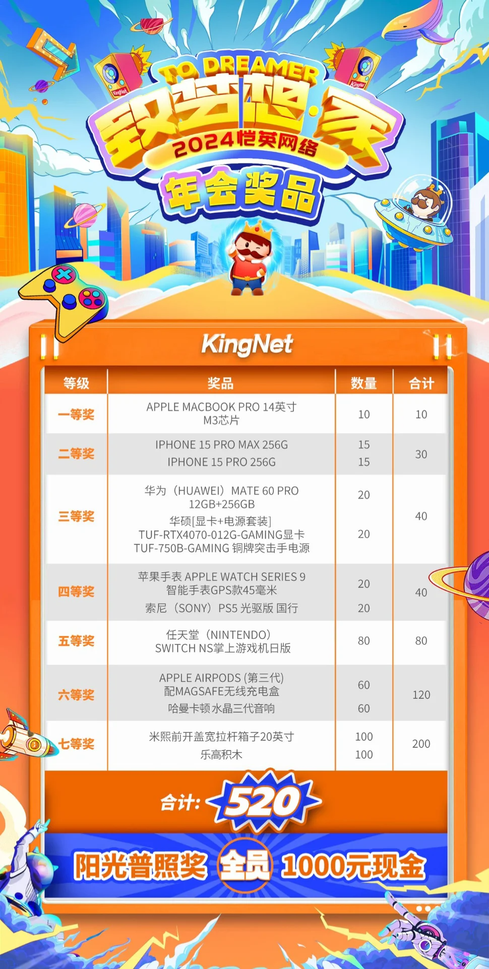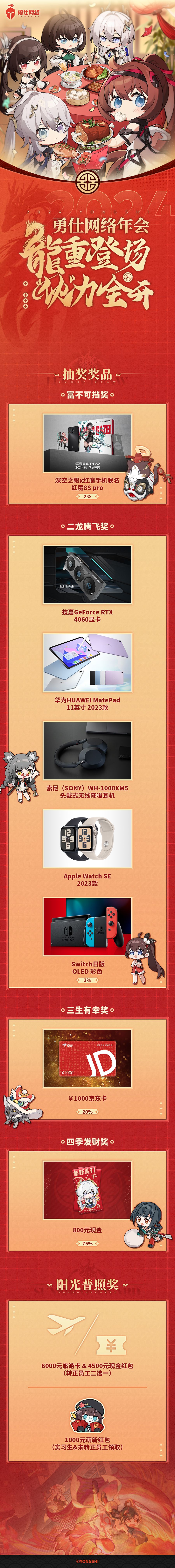 勇仕网络一等奖是自家游戏联名的手机,实物奖品均为电子产品,其余奖品则是以京东卡或现金的形式发放。阳光普照奖同样照顾到了实习生,直接送上1000元萌新红包。