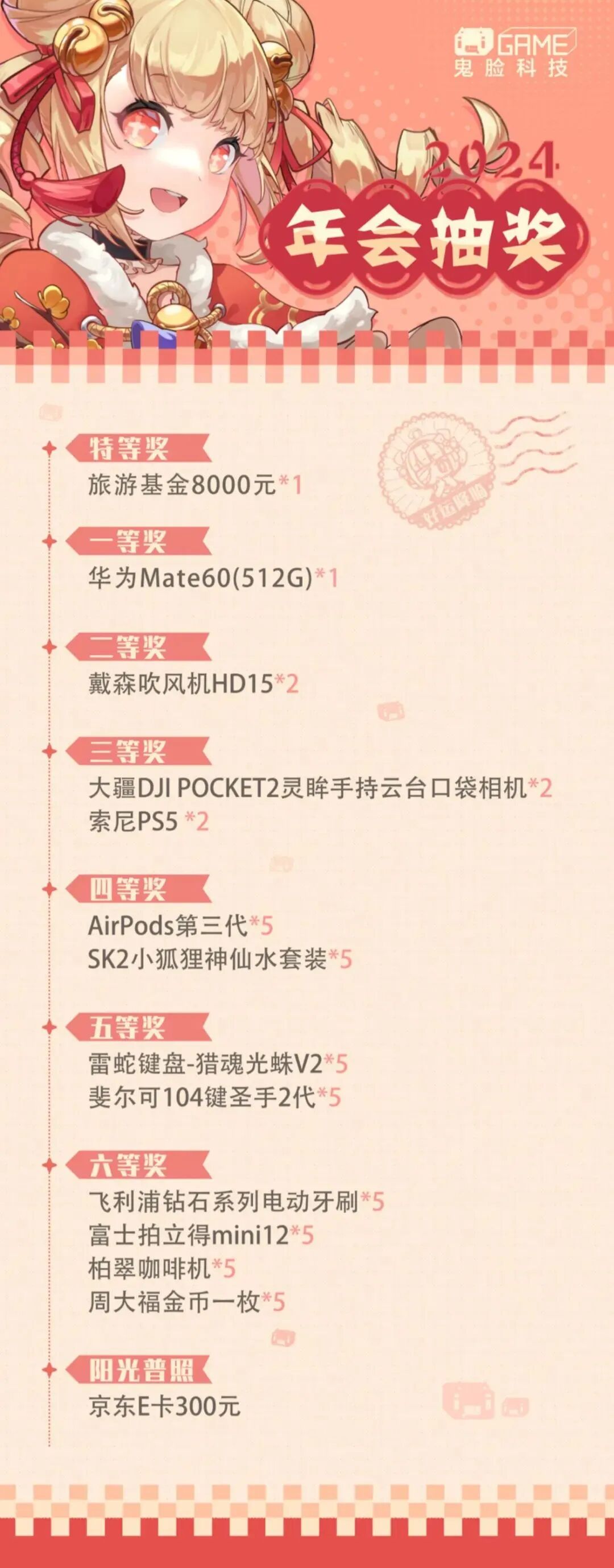 鬼脸科技的特等奖是8000元旅游基金,奖品选择上,除了电子产品,还有神仙水、咖啡机、金币等奖品。