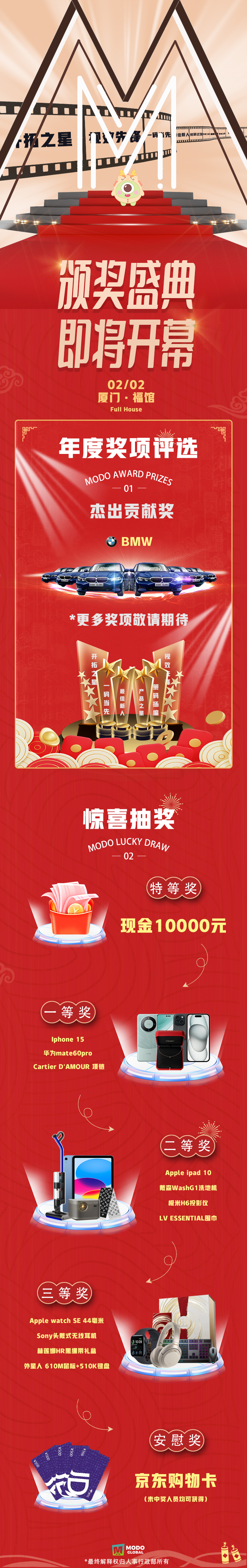 摩多科技紧随其后,年度杰出贡献奖将会送出一辆宝马,抽奖环节最高奖项是1w元现金,其余则是电子产品居多。