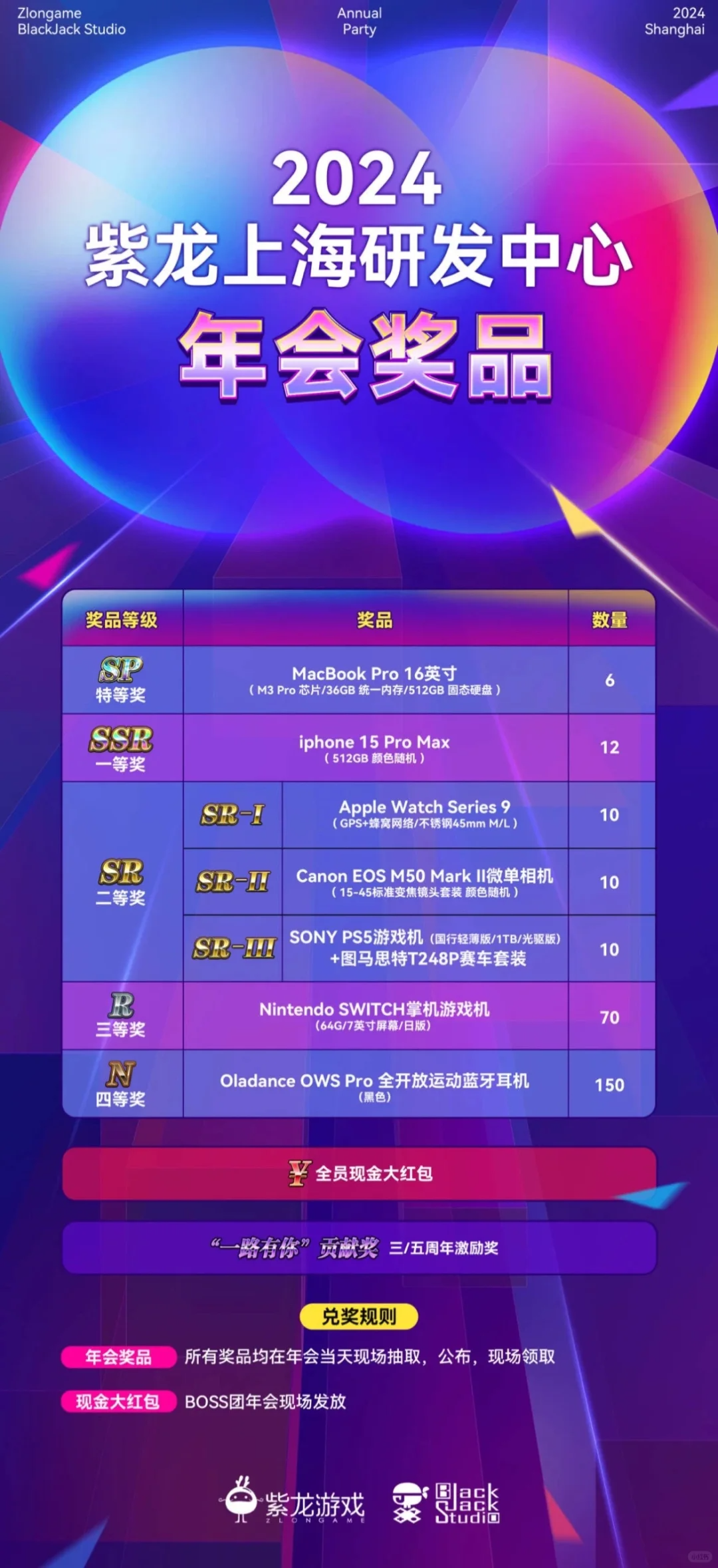 除了抽奖奖项外,还设置了全员现金红包,以及为入职三/五周年的员工准备了贡献奖。