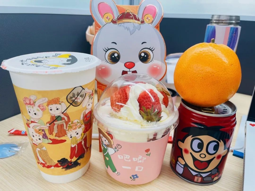 除了汤圆,网易有道还给大家准备了“大展宏兔”美食礼盒,奶茶、蛋糕、水果、旺仔牛奶,新的一年,就是要旺旺!