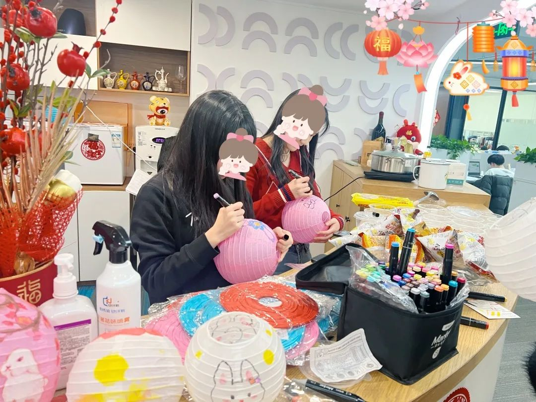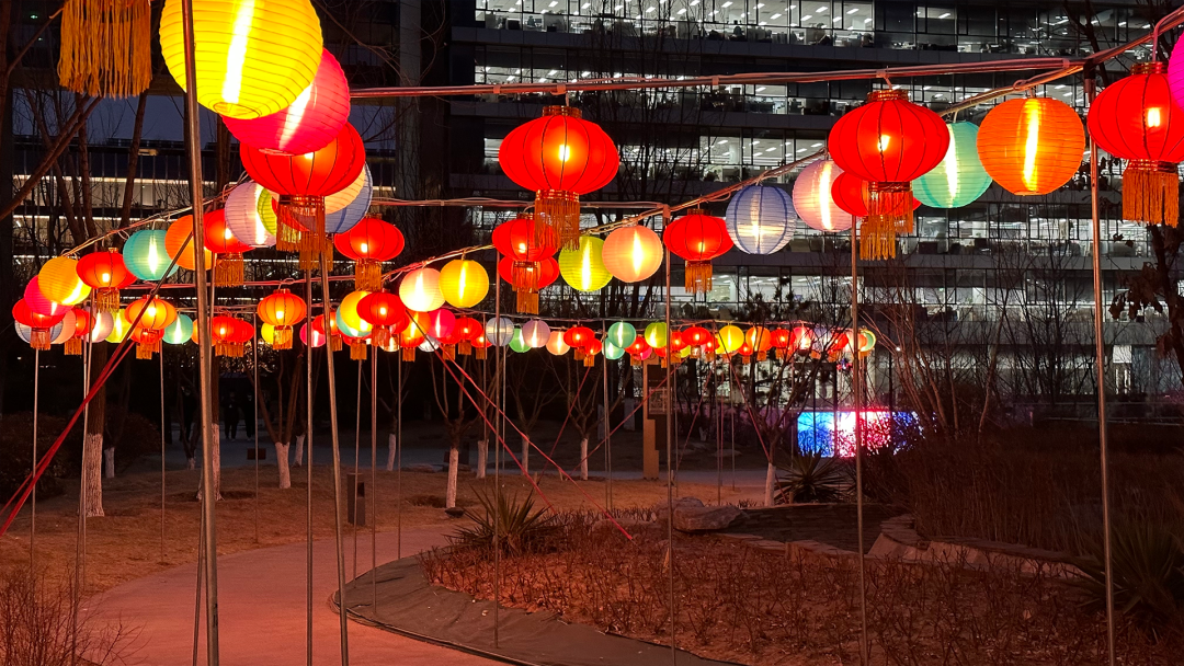 a.在灯笼上绘制或剪贴出各种吉祥图案,如福字、春字、动物等,既美观又有吉祥的寓意。网易有道将“天福宫”印在了灯笼上,天福——天赐之福,满园区的灯笼是对大家满满的祝福。