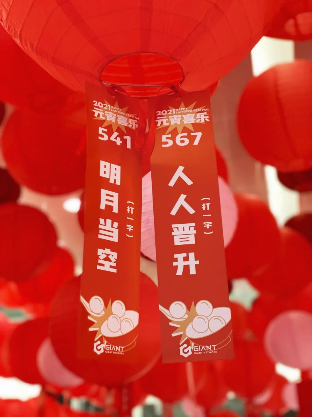 巨人网络在元宵节当天将大厅挂满了红红火火的谜语灯笼,既营造了元宵节热闹的氛围,又很符合元宵节的传统。