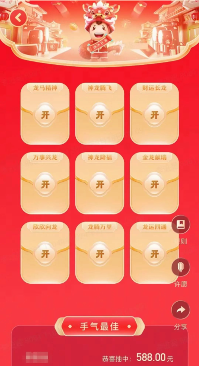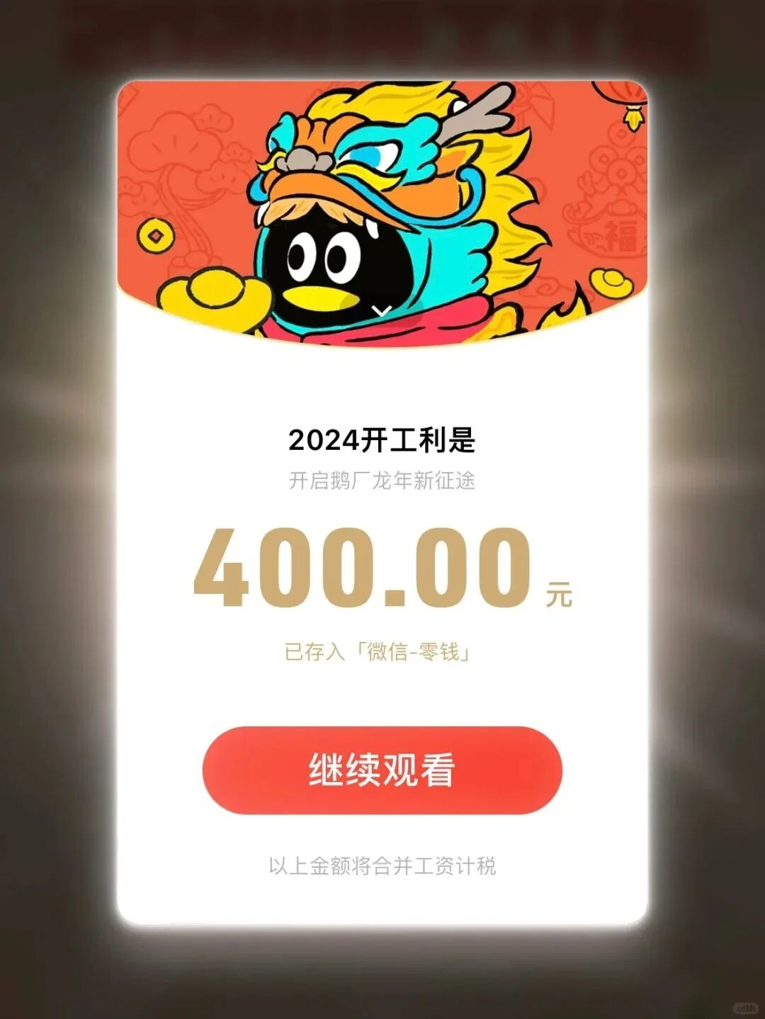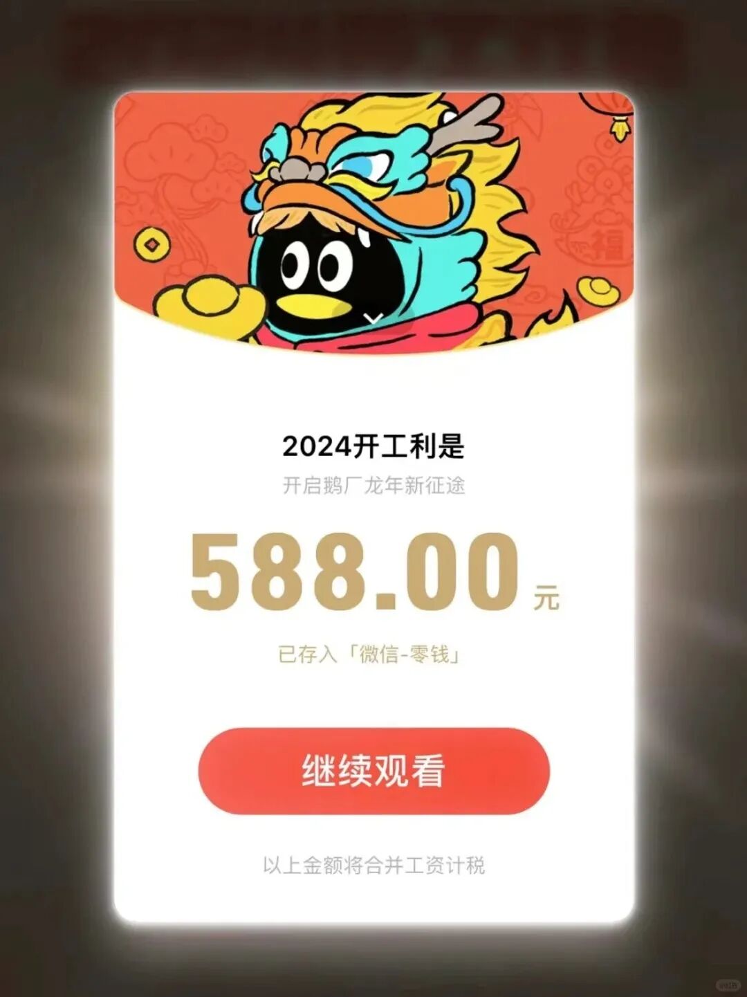 腾讯今年的开工利是采用了线上开盲盒的形式,除了往年传统的400,还有今年的隐藏款588、666、888,点开红包的时候,主打一个惊喜刺激!